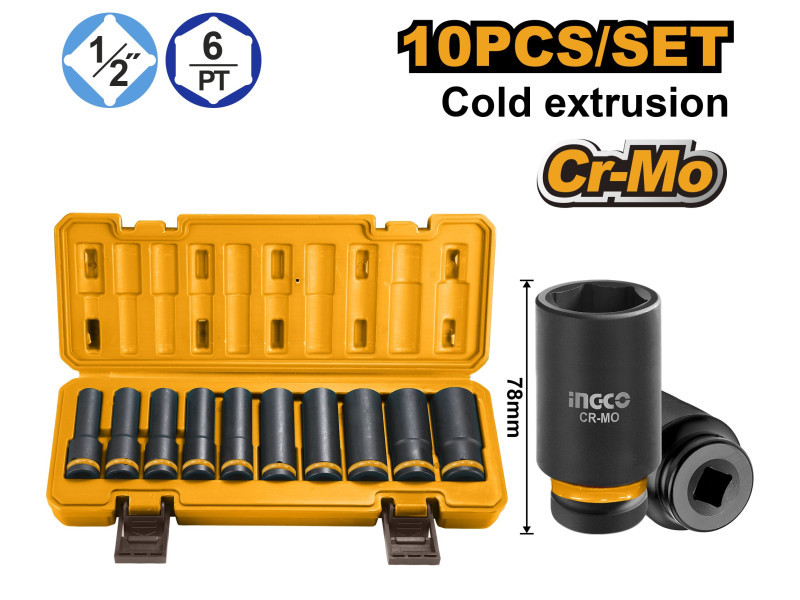 INGCO Gépi hosszú dugókulcs készlet 10 részes 1/2" 10-24 mm CrMo