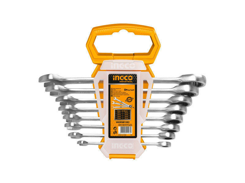 Szállítási terjedelem: 8 db racsnis csillag-villáskulcs, Műanyag akasztó