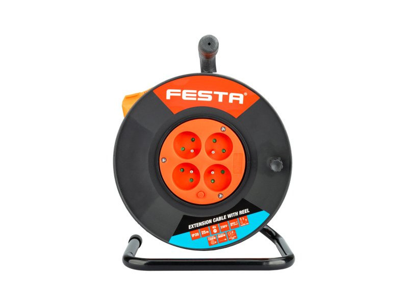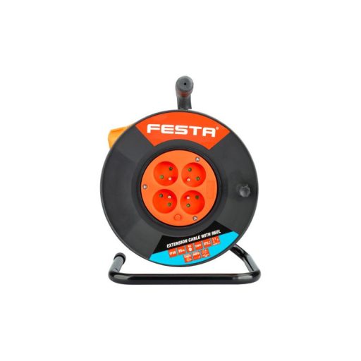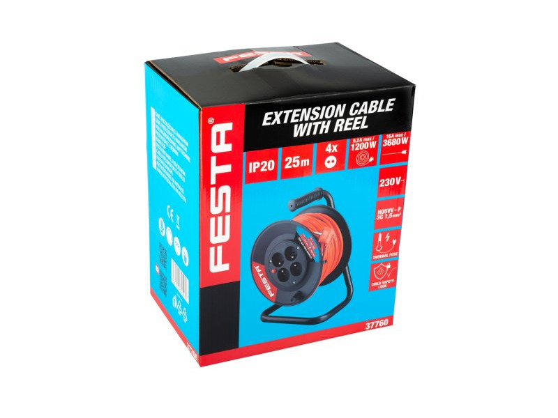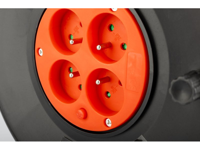 Hosszabbító kábel orsóval 4 csatlakozóaljzattal. Kábel hossza 25 m. Hőkapcsoló, aljzatok gyerekzárral, egymással szemben elhelyezett aljzatok, 16A/230V, max 1000W tekercses kábel, max.
