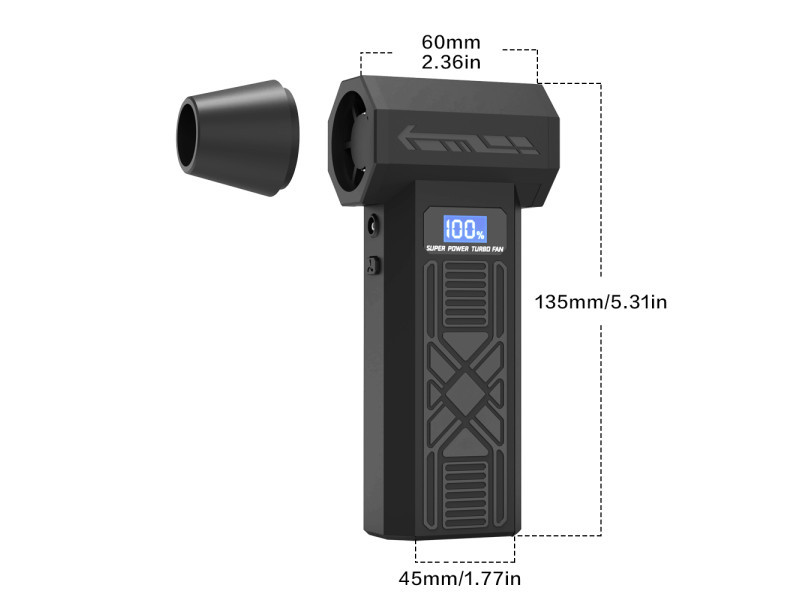 Vezeték nélküli mini turbó fúvóka sokféle otthoni és munkahelyi felhasználásra. Kézreálló, turbóventilátorral hajtva, amely akár 120000 fordulat/perc sebességre gyorsul fel a legmagasabb fokozaton. Az előállított légáram akár 180 gramm súlyú konyhai mérleget is megterheli.