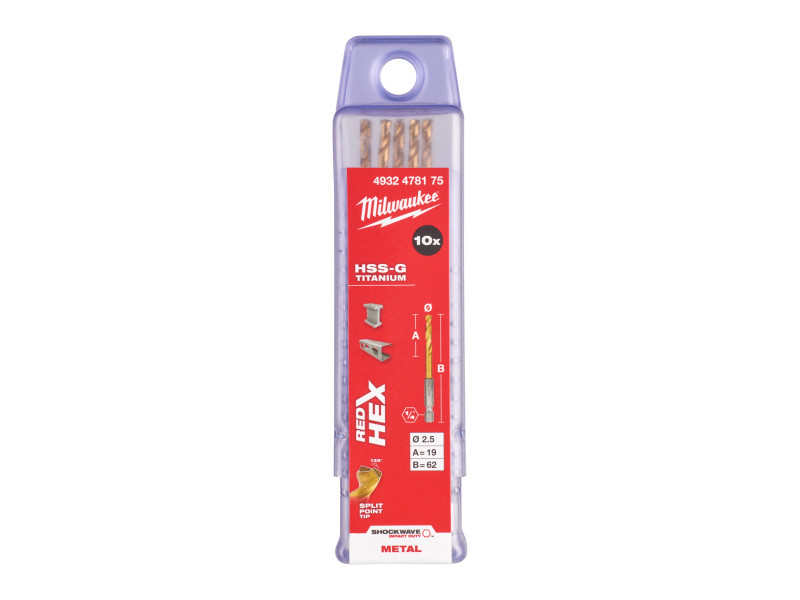 MILWAUKEE Csigafúró 2,5 x 62/19 mm HSS-G TiN, Red HEX - Shockwave™ (10 db)