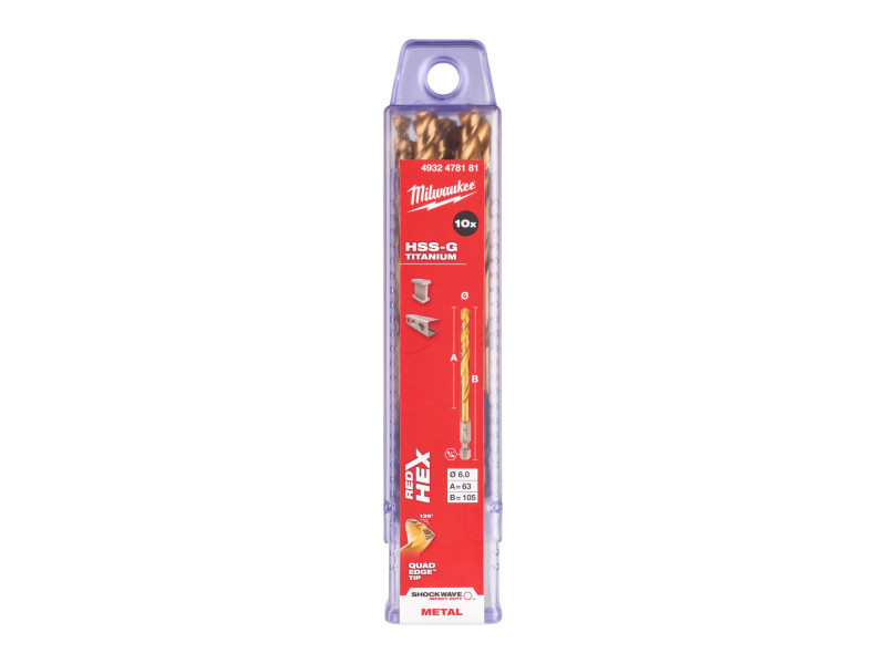 MILWAUKEE Csigafúró 6,0 x 105/63 mm HSS-G TiN, Red HEX - Shockwave™ (10 db)