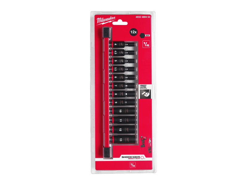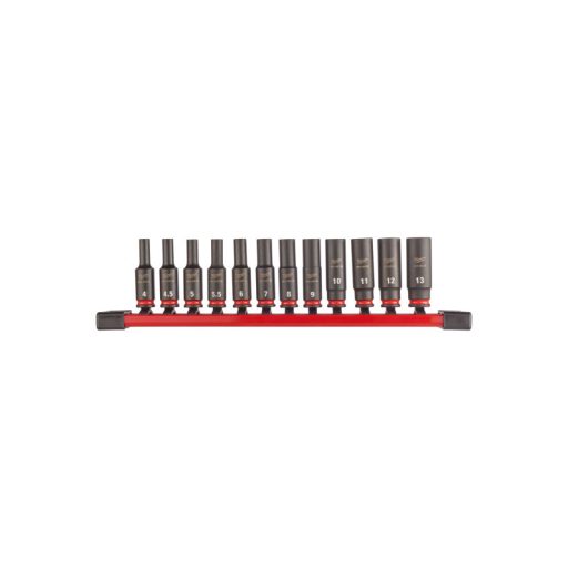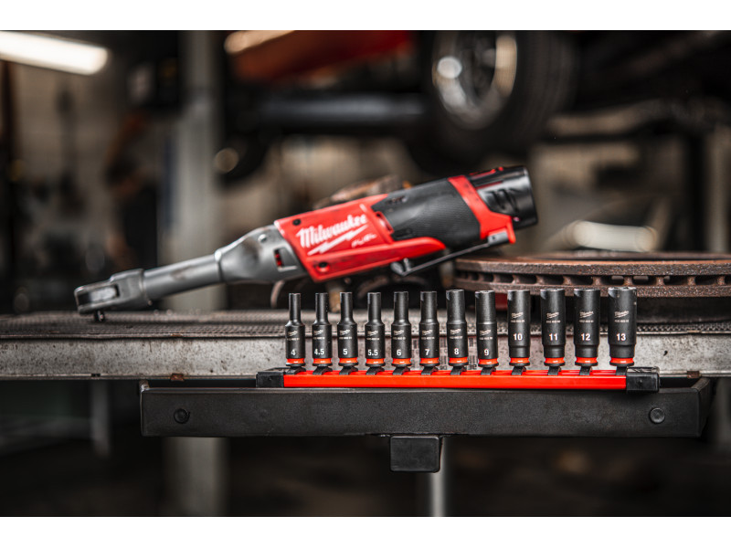 MILWAUKEE Gépi hosszú dugókulcs készlet tároló sínnel 12 részes 1/4" 4-13 mm CrMo