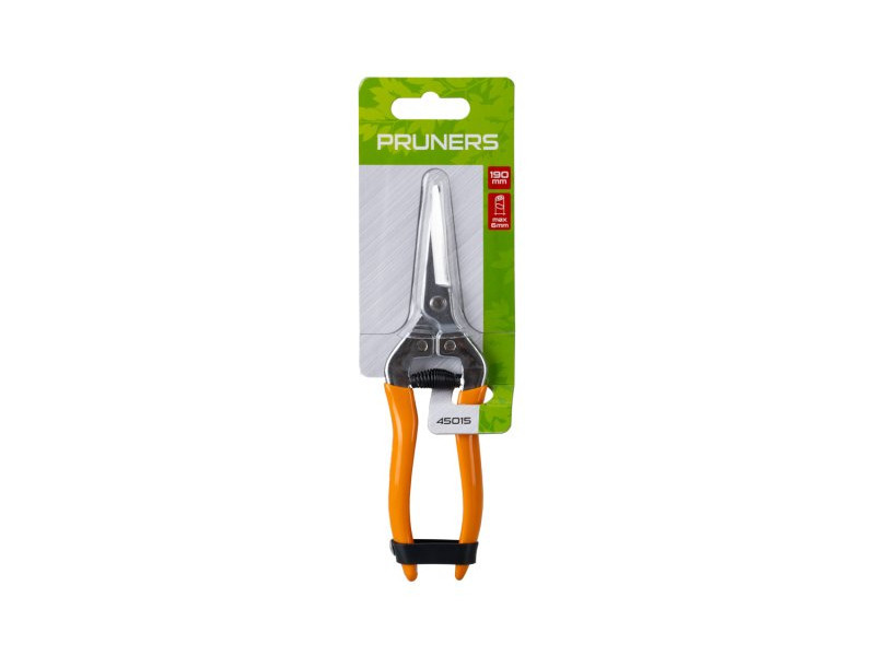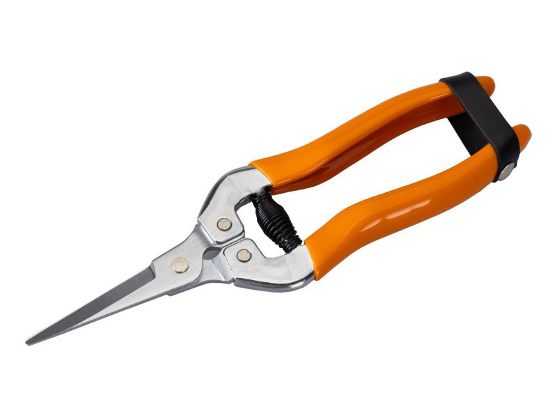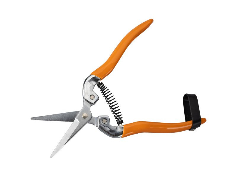 Kerti olló, egyenes penge, gumírozott ergonómikus formájú nyél, vékony egyenes pengék, felhasználás: különösen alkalmas szőlő és virág - rózsa betakarítására, teljes hossza 19 cm, csomagolás: buborékfólia Euro lyukkal.