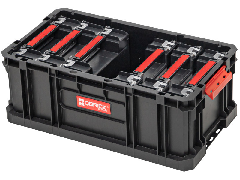 Moduláris, nagy teherbírású szerszámosláda poliamid csatokkal és szilárd fogantyúval.