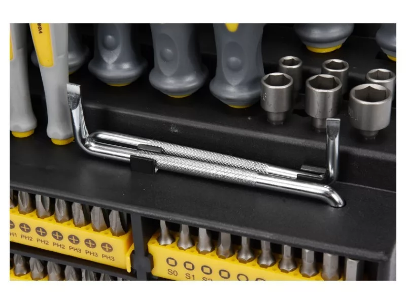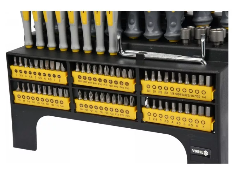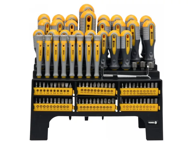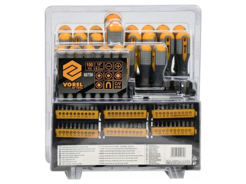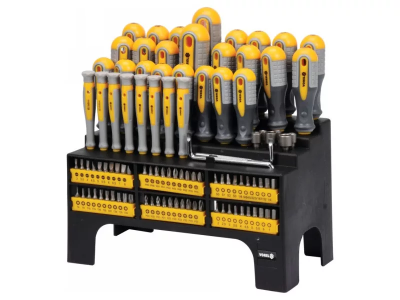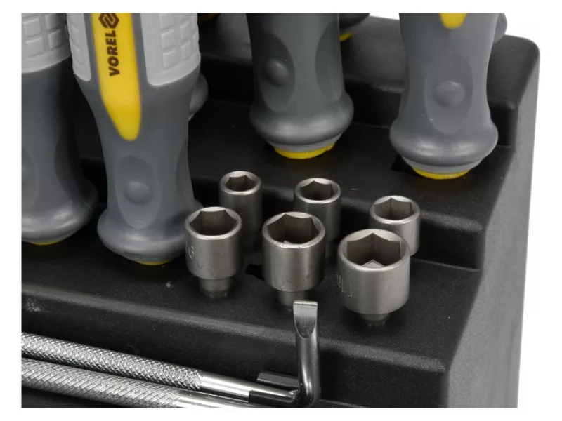 Kiváló minőségű anyagokból készült csavarhúzó készlet a Voreltől. A széles méretválaszték biztosítja a sokoldalú használatot és a nehezen hozzáférhető helyek elérését.