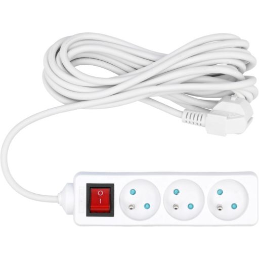 Klasszikus szalaghosszabbító kábel földelt aljzatokkal és kapcsolóval, amely minden aljzatban kikapcsolja az áramot.