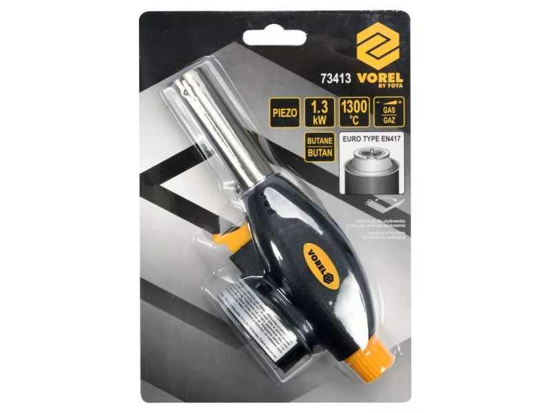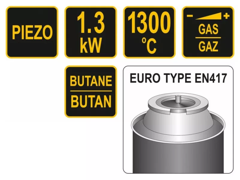 73413-as gázégő PIEZO gyújtással. Külső palackból származó butángázzal működik - az EN417 szabványnak megfelelően. Palackcsatlakozás TWIST típusú égőhöz.
