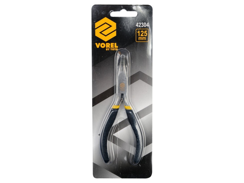 Görbe fogó 125 mm Vorel 42304. Fogazott pofafelület. Kényelmes műanyag kupakkal borított fogantyúk. Precíziós munkára tervezve.