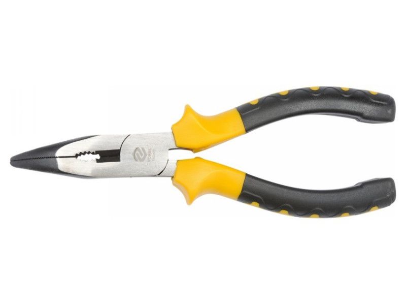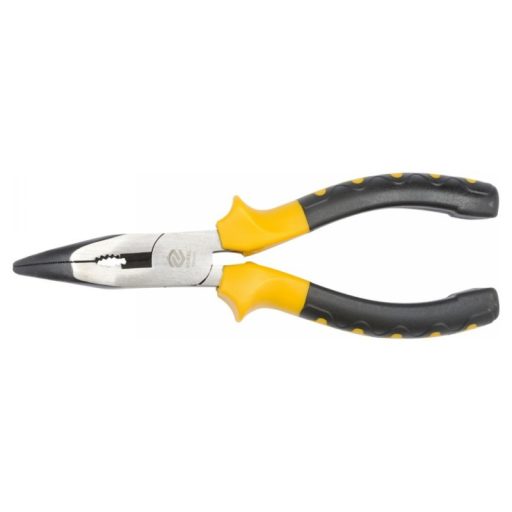Hosszúkás hajlított fogó 180 mm Vorel 40051. Fogazott pofafelület profilozott vágóélekkel. Kényelmes kétkomponensű műanyag kupakkal burkolt fogantyúk. Stabil csatlakozócsukló a nagy terhelések elviseléséhez.