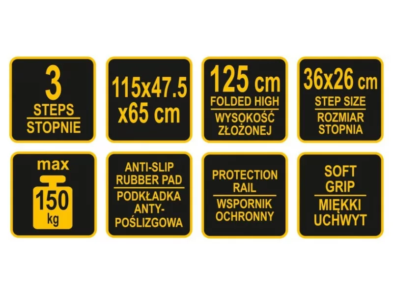 A létra 3 36x26 cm méretű lépcsőfokot tartalmaz, amelyek ráadásul csúszásgátló párnákkal vannak ellátva . Ez lehetővé teszi, hogy magabiztosan és stabilan álljon rajta anélkül, hogy félnie kellene a megcsúszástól vagy megbotlástól. A létra tetején lévő, puha szivacsbéléssel ellátott kiegészítő védőkonzol véd a leesés ellen, ugyanakkor nagyon kényelmes a szállítása.