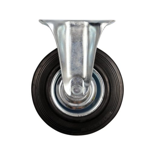 Kerékátmérő 200 mm, fix rögzítéssel, csapágyazással, fekete gumiabroncs, magasság 195 mm.