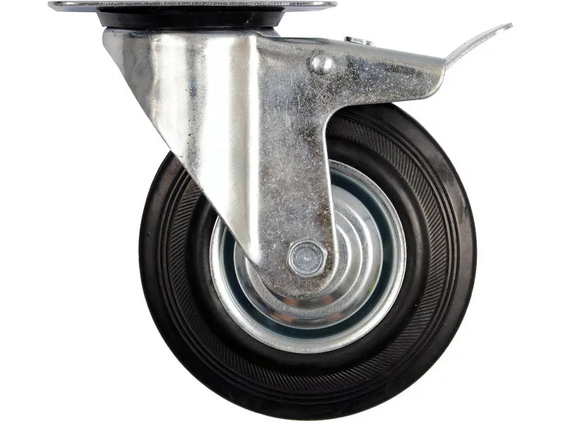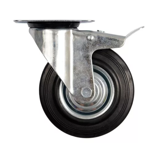 Kerékátmérő 125 mm, forgatható, csapágyazott, fékkel, fekete gumiabroncs, magasság 155 mm.
