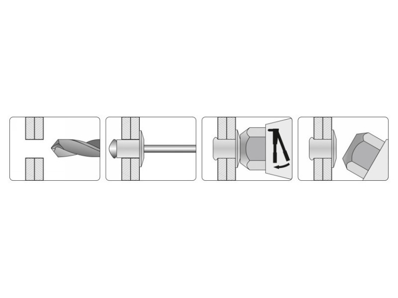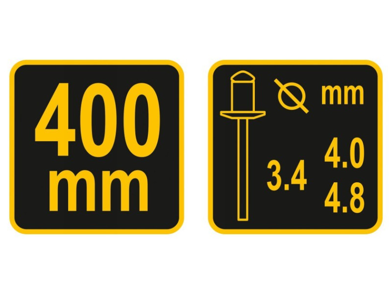 - Kezeli a szegecseket a tartományban: 4,0 mm, 4,8 mm, 4,4 mm, 4,0 mm, 4,8 mm
