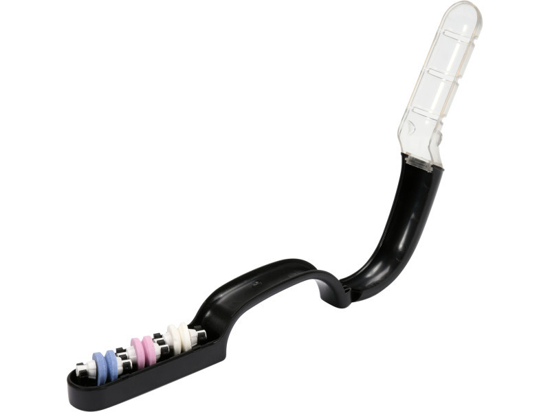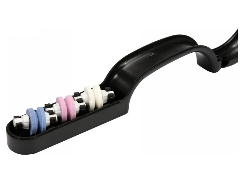 Az élezőtárcsák a rendeltetéstől függően kerámia anyagból, krómkorundból és alumínium-oxidból készülnek. Ez garantálja az optimális előélezési és finomélezési eredményeket. A megfelelő tárcsaszögek, a pengevezető nyílások és a víz használata biztosítja a hatékony és pontos élezést.