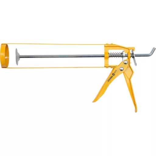 Könnyű, fémlemezből készült tömegextruder, amely alkalmas tipikus 300 ml-es, 230 mm hosszúságú csövekhez, szilikonnal vagy ragasztóval.