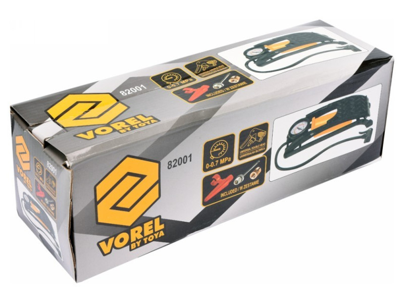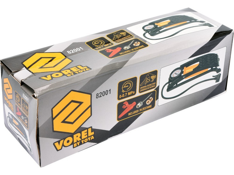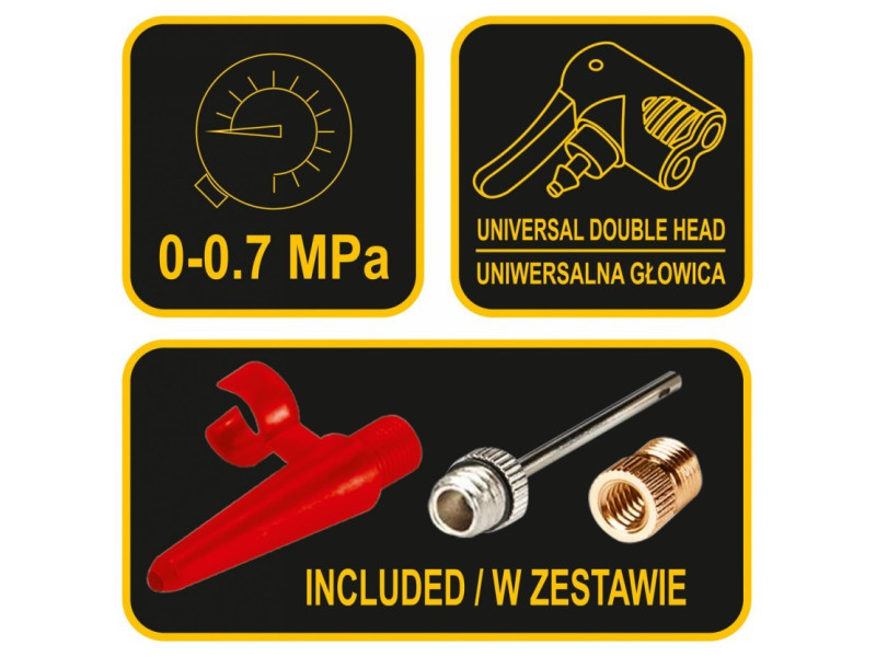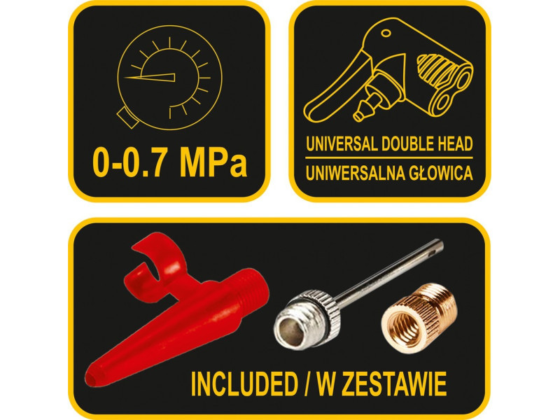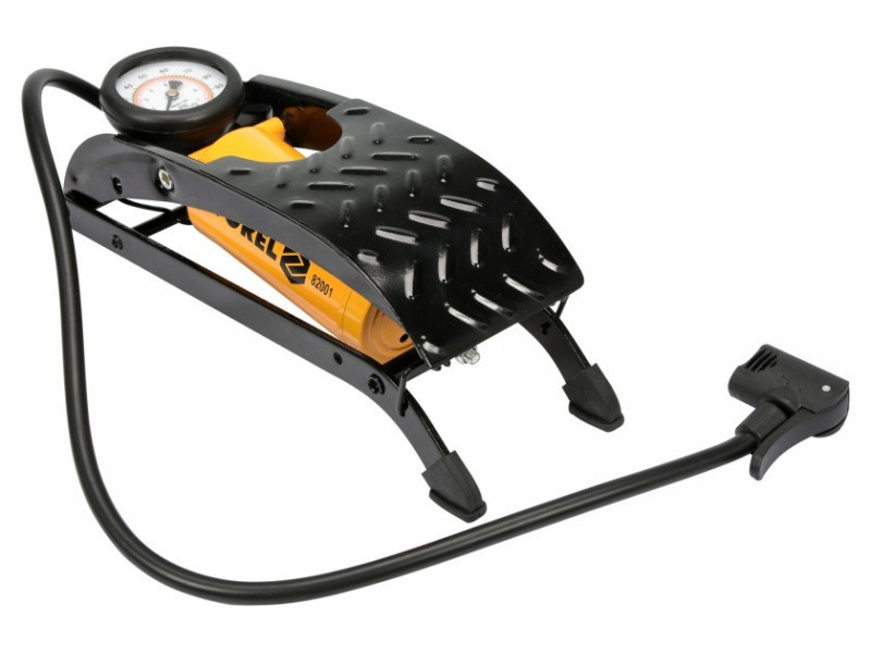 Egydugattyús lábszivattyú nyomásmérővel. Fémből készült, rugalmas csővel végződő univerzális fúvókával, amely lehetővé teszi mind az autó-, mind a kerékpárszelepek szivattyúzását. A nyomásmérő 7 BAR-ig beosztott. Tartalmaz továbbá univerzális csúcsokat labdák, matracok stb. szivattyúzásához.