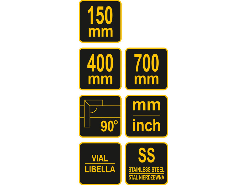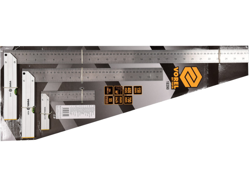 Három darab 150 mm, 400 mm és 700 mm hosszúságú fém szögvasból álló készlet, derékszögek kijelölésére.