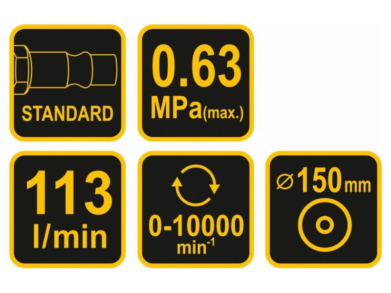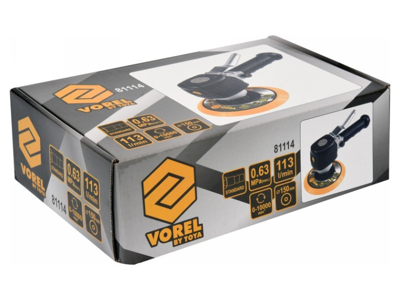 A csiszoló a pneumatikus rendszerhez való csatlakoztatáshoz szükséges csatlakozóval van felszerelve. A csiszológép 150 mm átmérőjű tárcsával van felszerelve. A tárcsa felszereléséhez nincs szükség további szerszámokra.