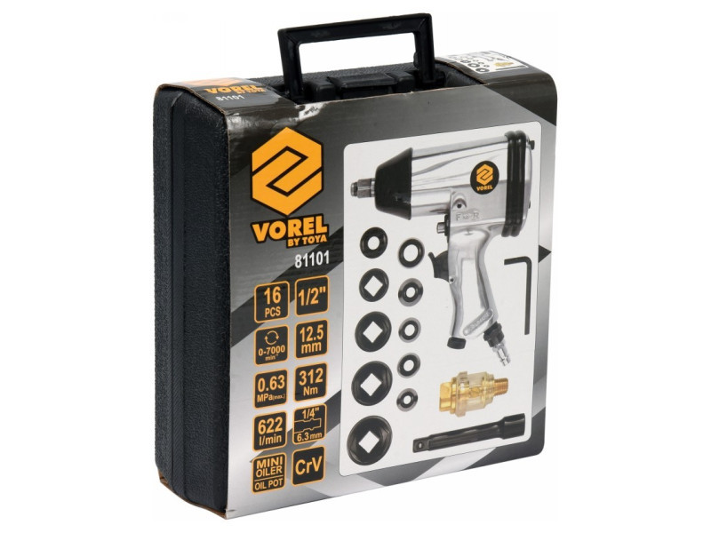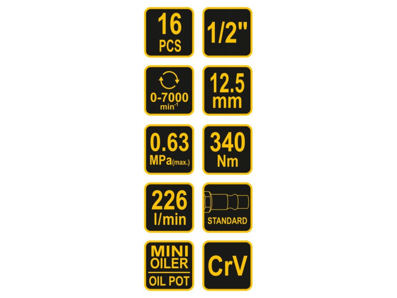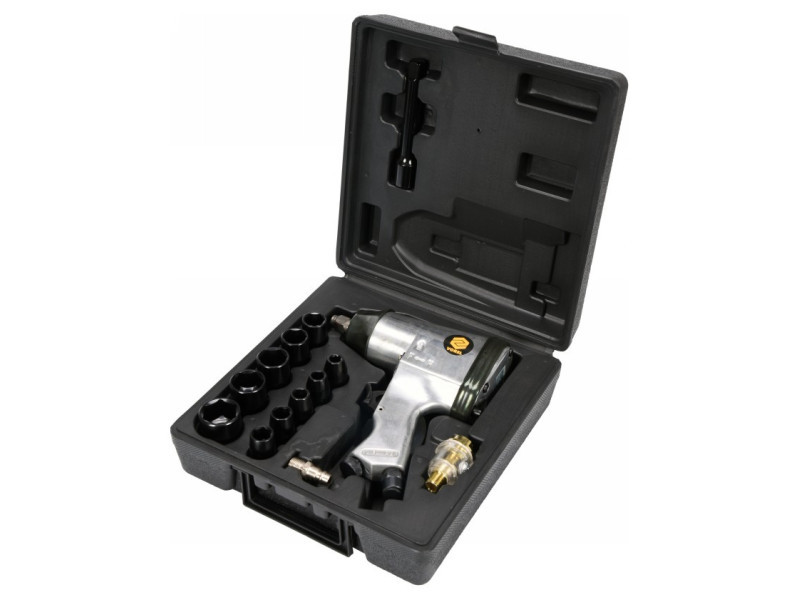 | Állítsa be a tartalmat | pneumatikus kulcs, tömlőcsatlakozó, hatszögű foglalat x10 (9, 10, 11, 13, 14, 17, 19, 22, 24, 27), hosszabbítás 1/2" (12,7 mm); (H=125 mm), 4 mm-es imbuszkulcs, mini olajozó |