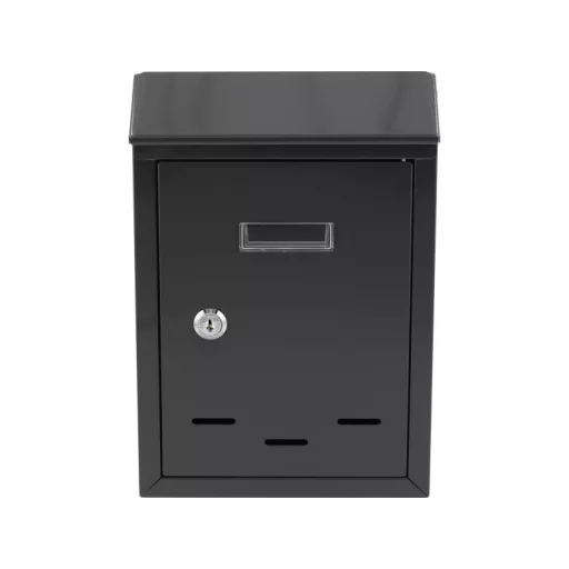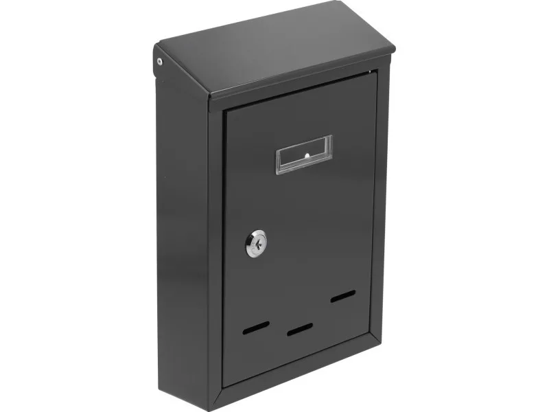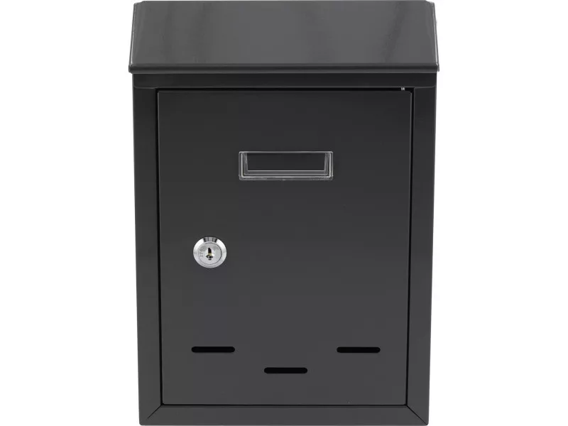 285x200x60mm méretű levélszekrény. 0,6 mm vastag horganyzott acéllemezből készült, grafit színben. A postaláda tetején egy nyílás található védőfedéllel. Az elülső oldalon egy műanyag panel található, amelyre cím- vagy névazonosító kitűzőt lehet rögzíteni. Az elülső ajtó zárható. Két kulcsot szállítunk. A hátoldalon rögzítőfuratok találhatók. Nettó súlya 0,88 kg.