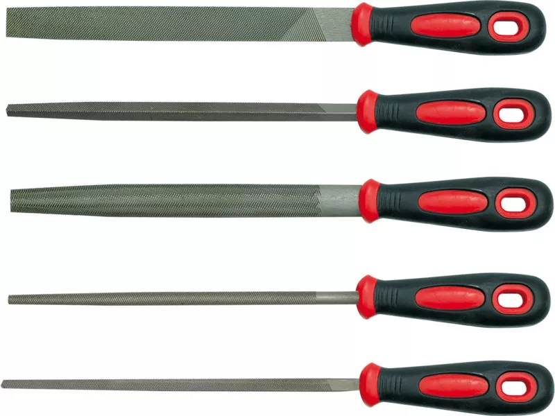 A készlet lapos és félköríves profilú, valamint kerek, háromszögletű és négyzet alakú konvergáló reszelőket tartalmaz.