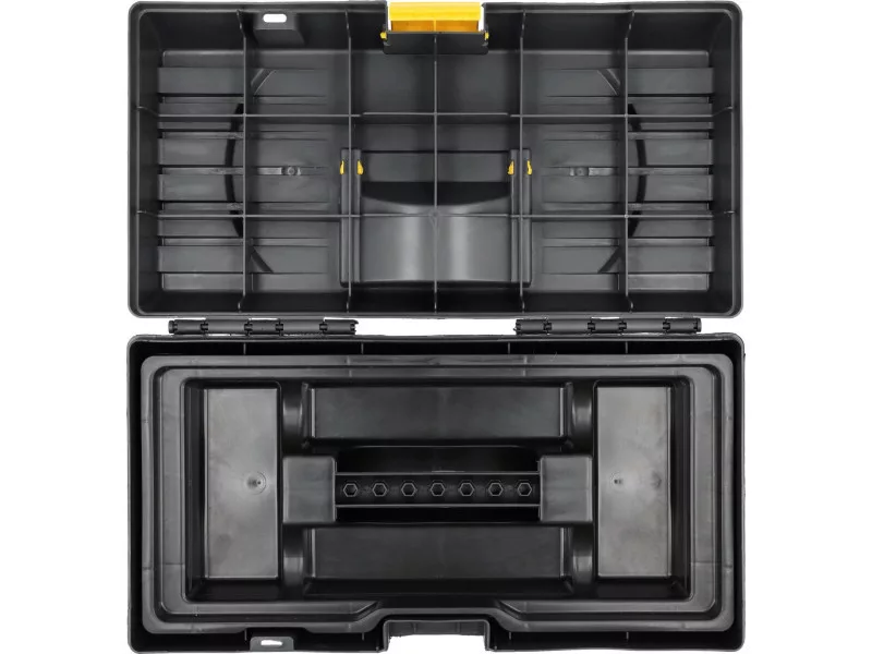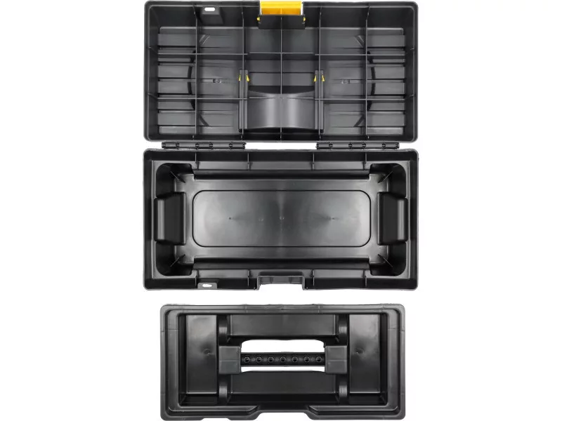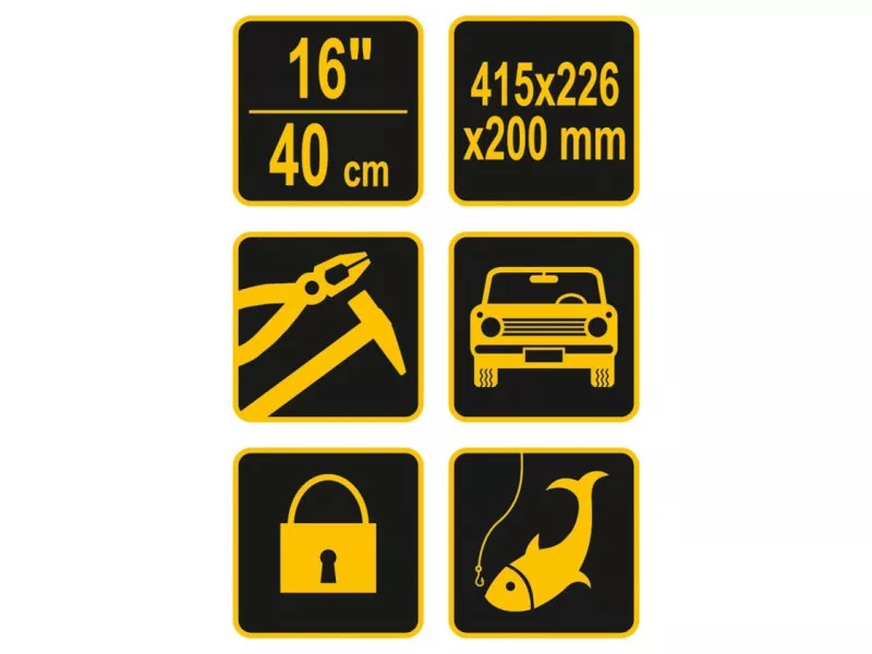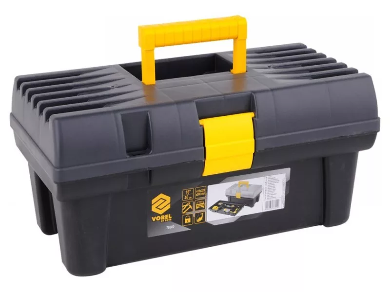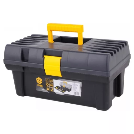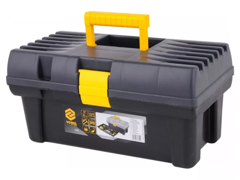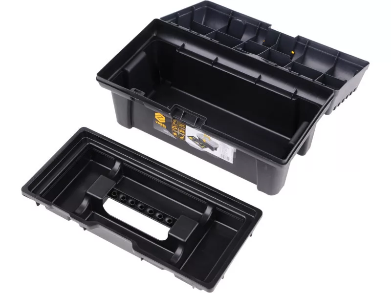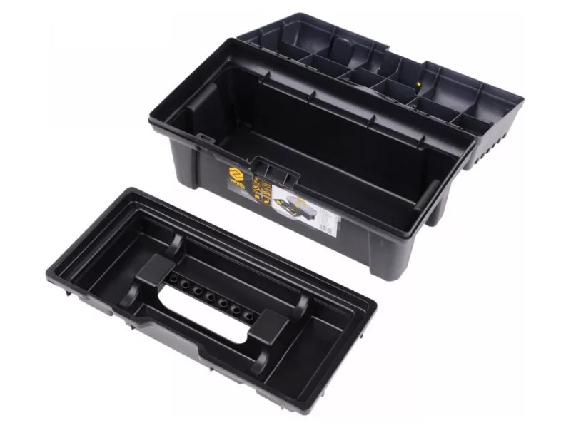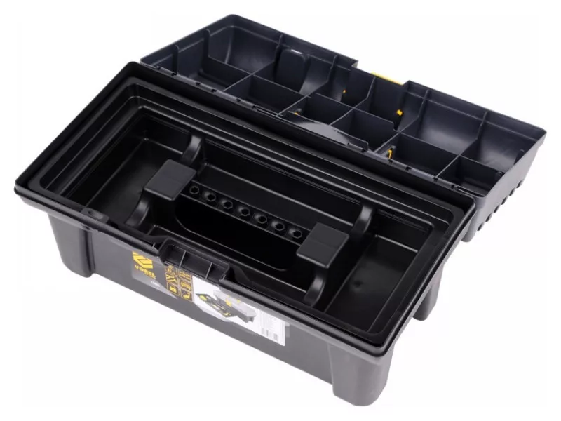 16"-os szerszámosláda kihúzható tálcával és bit-tartóval. Műanyagból készült. A robusztus rögzítés megakadályozza a nem kívánt kinyílást kezelés közben. A doboz speciálisan kialakított oldalsó fogantyúkkal rendelkezik a könnyű hordozás érdekében. Lakattal zárható. Különböző típusú tárgyak, pl. szerszámok, horgászkellékek stb. kényelmes szállítására szolgál.