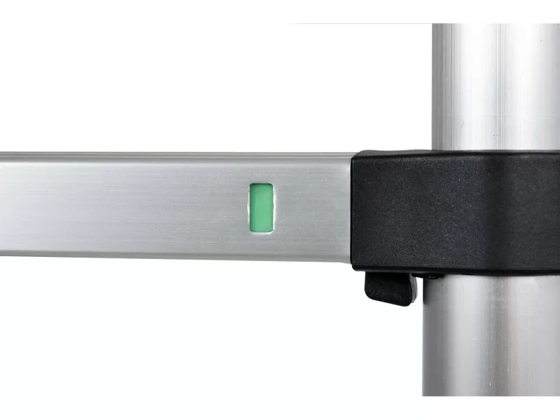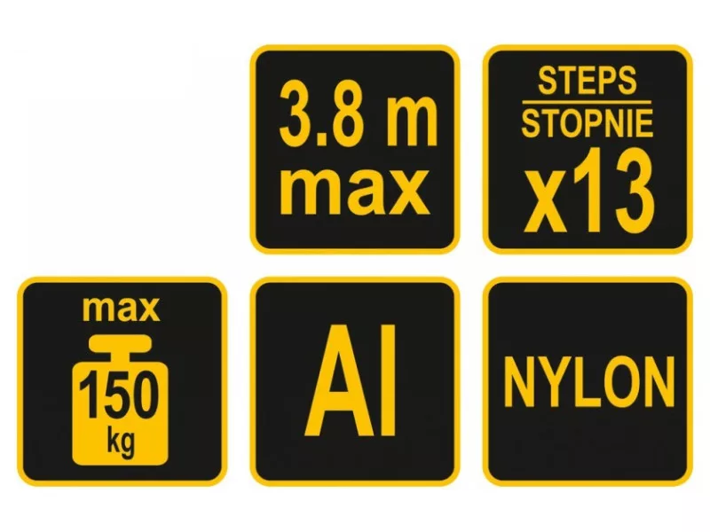 Ezenkívül a felső peremtől 1 m-re egy figyelmeztető lépcsősorral rendelkezik, amely jelzi a maximális biztonságos munkamagasságot. A csúszásmentes lépcsősorok pedig speciálisan hullámos felülettel rendelkeznek, csökkentve a lábak megcsúszásának és leesésének kockázatát. Ezenkívül a létra öntött csúszásgátló gumilábakkal rendelkezik, amelyek jó tapadást biztosítanak a talajon, és megvédik a karcolásoktól.
