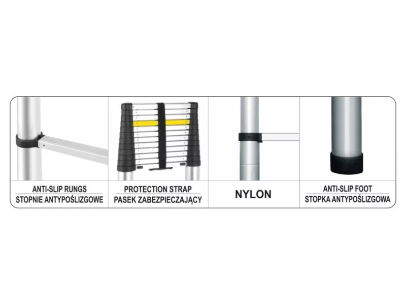 Kiváló minőségű anyagokból készült. A teleszkópos profilok és a lécek alumíniumból készültek. A lépcsőfokok és a teleszkópos lépcsőfokok közötti összes csatlakozás pedig nejlonból készült - olyan anyagból, amely ellenáll az alacsony hőmérsékletnek (nem reped meg a hidegben) és az időjárásnak (nem morzsolódik le néhány év után). A magas minőséget az EN131-6:2015 tanúsítványok is megerősítik.
