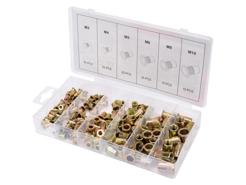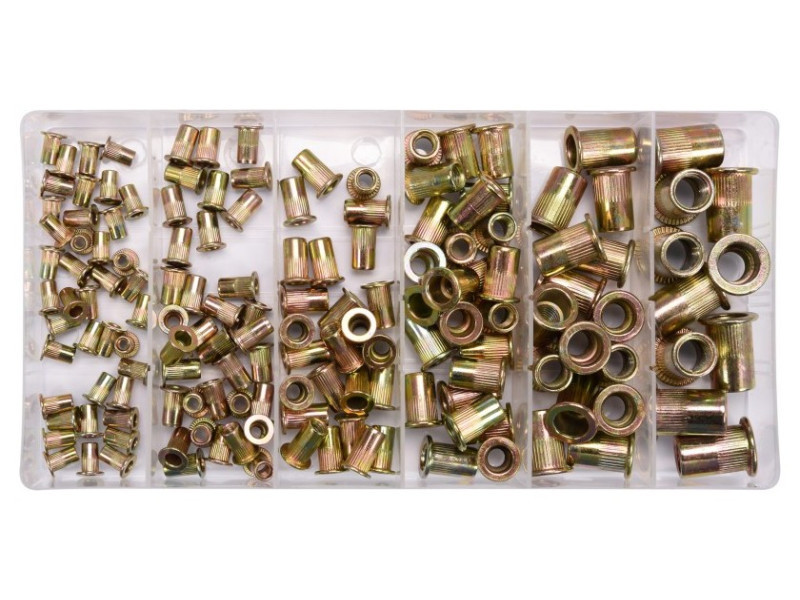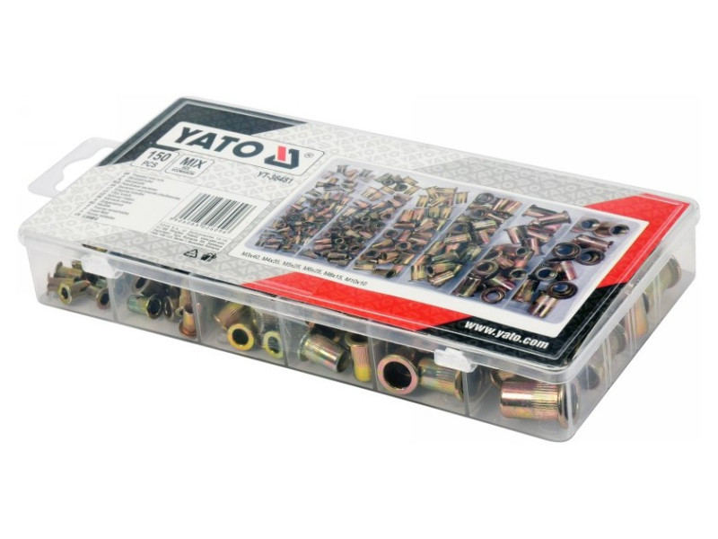 M3 - M10 méretű acél szegecsanyák készlete a YATO-tól. Hengeres gallér, bordázott, így jobban tapad a rögzítendő alkatrészhez.