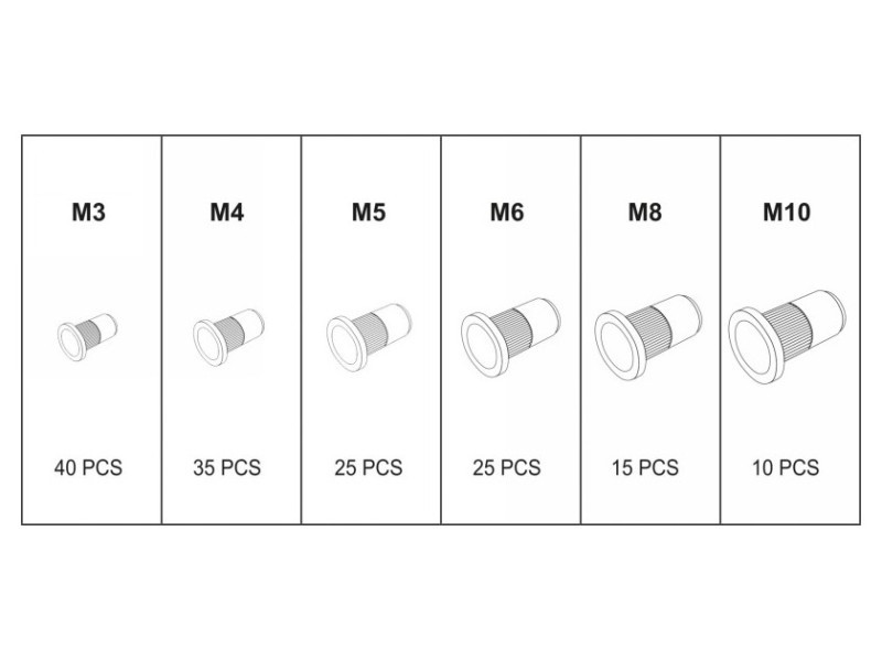 | Állítsa be a tartalmat | szegecsanyák (M3 x40, M4 x35, M5 x25, M6 x25, M8 x15, M10 x10 |