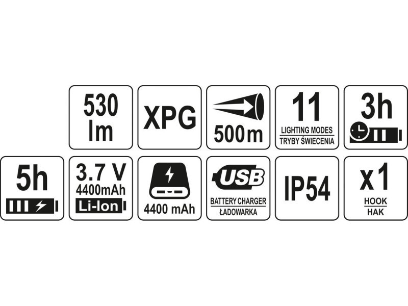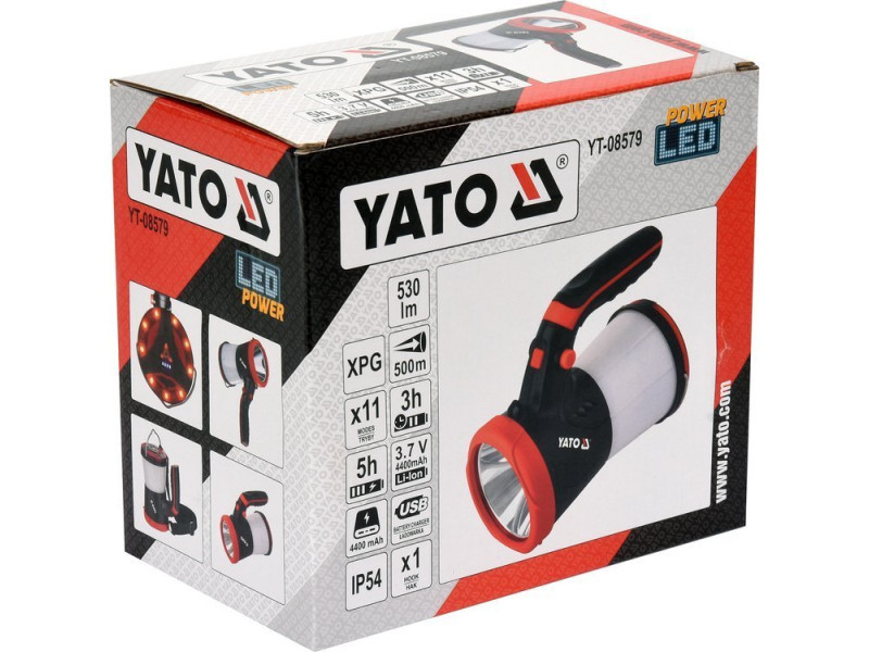 Kialakításának és akár 11 üzemmódjának köszönhetően a YATO multifunkciós keresőfény tökéletes kempingezéshez, túrázáshoz, házimunkához vagy figyelmeztető lámpának az autóban. A fejlámpa 500 m hatótávolságot és 530 lumenes megvilágítást biztosít. Nagy teljesítményű 3,7 V-os 4400 mAh lítium-ion akkumulátorral felszerelve 3-tól akár 150 órás üzemidőt biztosít, és képes más eszközök töltésére - powerbank funkció.
