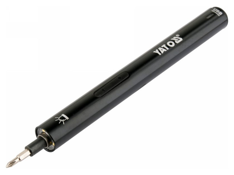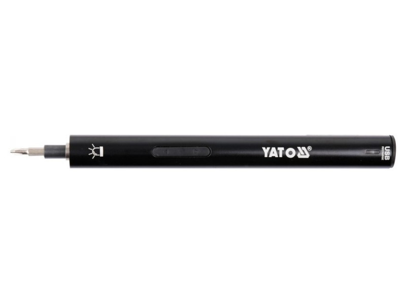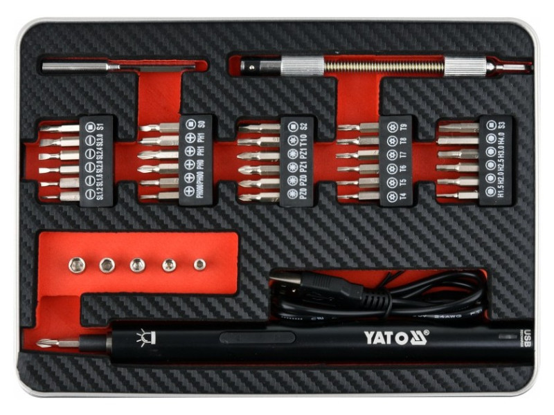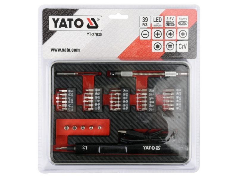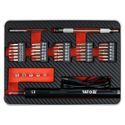 Precíziós 3,6 V-os akkumulátoros csavarhúzó 39 bites Yato YT-27930, amely egy készlet bitet és hosszabbítót tartalmaz, precíziós munkákhoz, például elektronikai berendezések javításához.