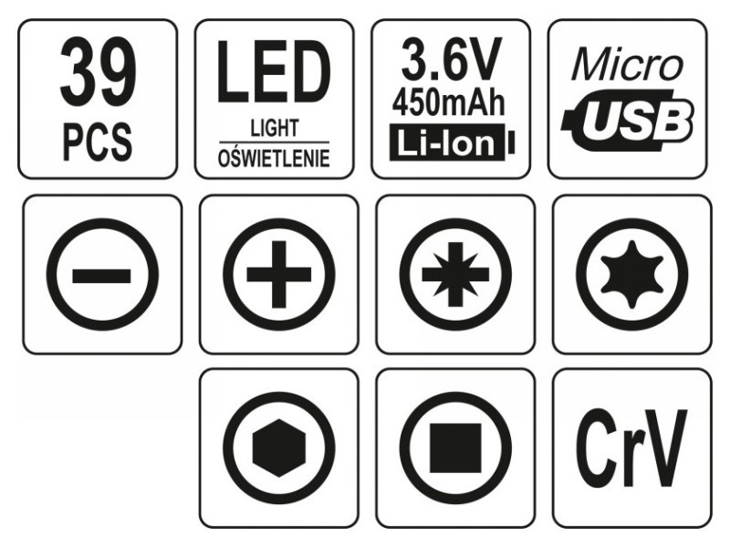 - 3,6 V-os 450 mAh-s csavarhúzó LED-es világítással és az óramutató járásával megegyező/ellenkező irányú irányváltással.