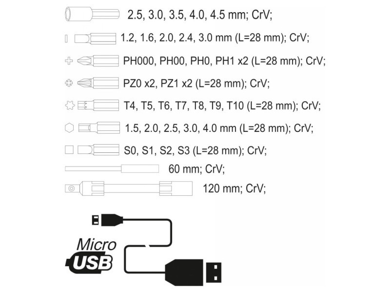 | Állítsa be a tartalmat | akkus csavarhúzó, bit x30, mágnessapka x5, kiterjesztés x2 |