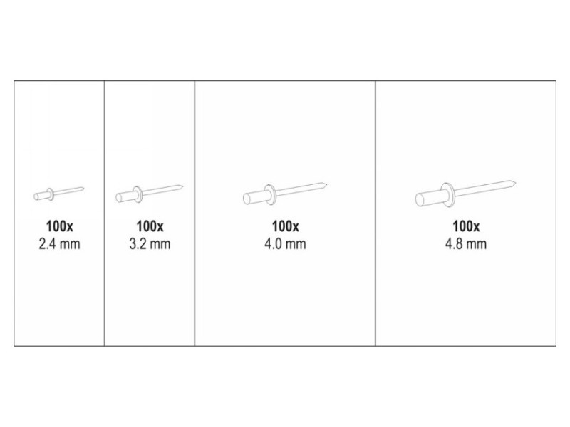 • Szegecs méretek (átmérő x darab): 2,4 mm x 100 db, 3,2 mm x 100 db, 4 mm x 100 db, 4,8 mm x 100 db
