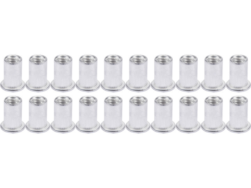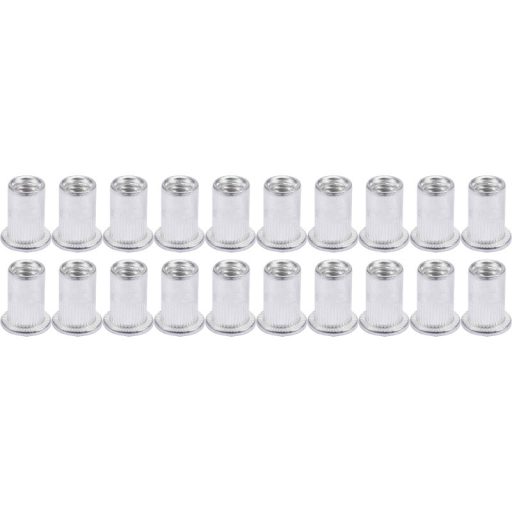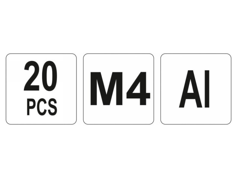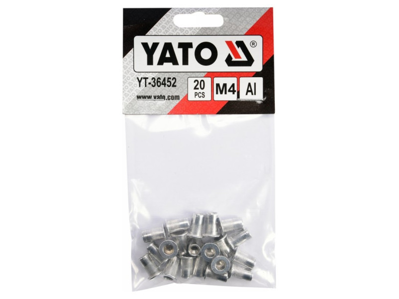M4-es méretű alumínium szegecsanyák a YATO-tól. A bordázott hengeres perem nagy ellenállást biztosít puha anyagokban való alkalmazáskor.