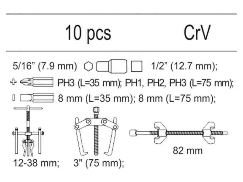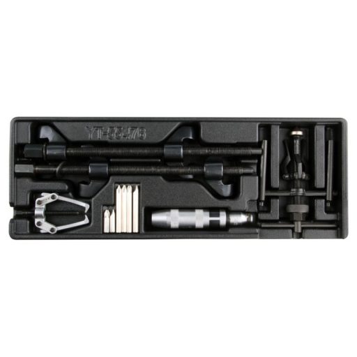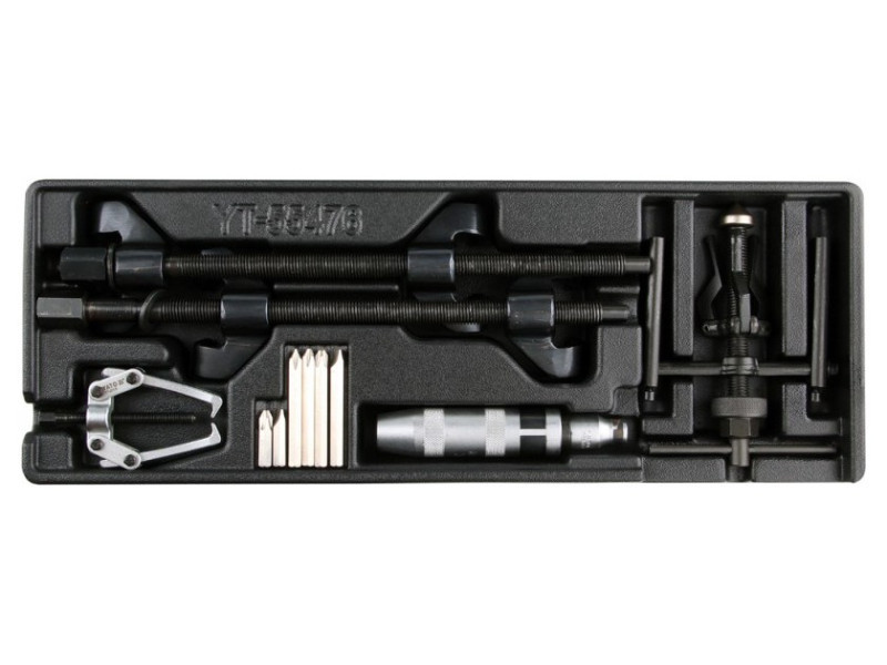 Műhelyszerszámkészletet tartalmazó fiókbetét. Tartalmaz MCpherson rugóhúzót, csapágyhúzót, ütvecsavarhúzót bitekkel - betét - ütvecsavarhúzó YT-2802 cserélhető bitekkel - rugóhúzó YT-2544 - csapágyhúzó YT-2510 - háromkarú húzó YT-2515 hossza 75 mm.