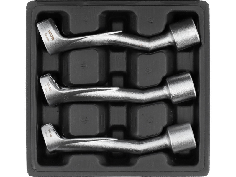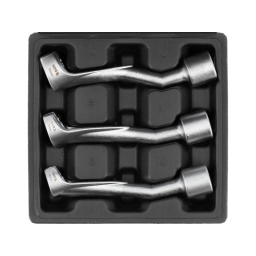 Három darab 1/2"-os kulcskészlet üzemanyag-befecskendezőkhöz és befecskendező szivattyúkhoz. A kulcsok kiváló minőségű króm-vanádium acélból készültek, a készlet BMW, VW, Mercedes-Benz autókhoz használható.