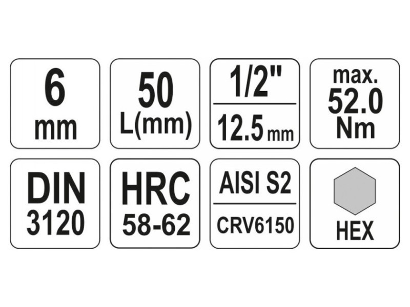 Professzionális HEX tengelykulcs, hüvelyméret 1/2", szárméret 6 mm.