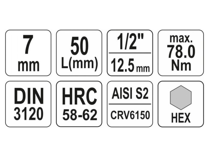 Professzionális HEX tengelykulcskulcs, hüvelyméret 1/2", szárméret 7 mm.