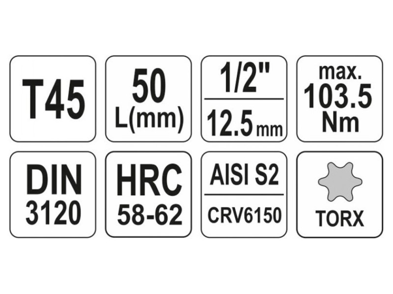 Professzionális Torx tengelykulcs, 1/2" hüvelyméret, T45-ös szárméret.