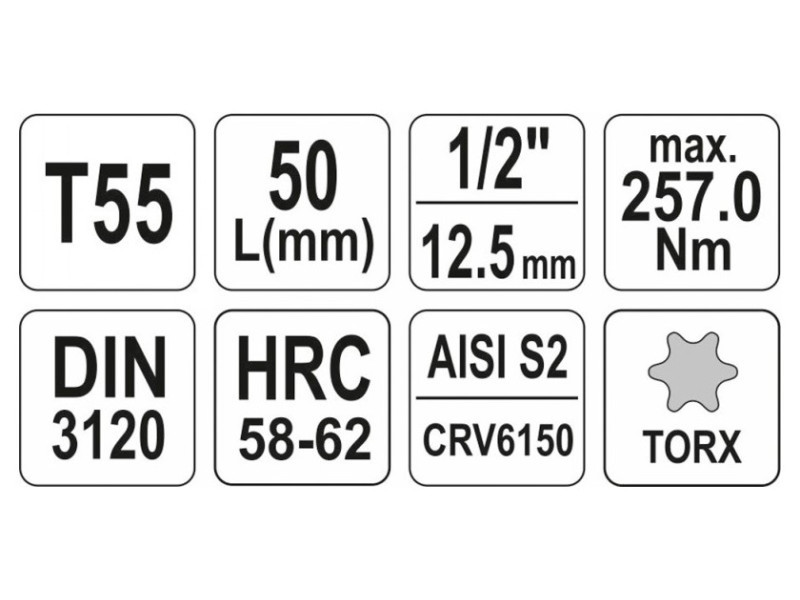 Professzionális Torx tengelykulcs, 1/2" hüvelyméret, T55-ös szárméret.