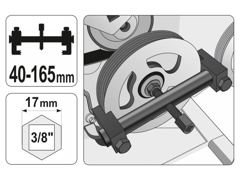 Professzionális húzókészülék többszörös V-bordás és többszörös V-bordás szíjtárcsákhoz, generátorokhoz, klímaberendezésekhez, vízpumpákhoz, forgattyús tengelyekhez stb. 165 mm-ig terjedő kezelt átmérőjű tartomány. Rendelkezik precíziós bevágásokkal a karokon - speciális csavarokkal rögzítve. - a kis méretek lehetővé teszik a nehezen hozzáférhető helyeken történő munkavégzést - az orsótalpakon lévő bevágások megfelelnek a keréken lévő hornyoknak a sérülések elkerülése érdekében - az orsóhúzó edzett, edzett acélból készült - munkatartomány 40 mm - 165 mm - az orsótalpakat gombokkal nyomják és reteszelik - a karok reteszeléséhez imbuszkulcs tartozék Járműipari műhelyek, ipar - orsóhúzó - imbuszkulcs.