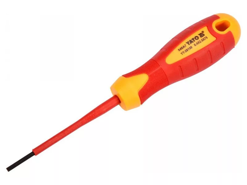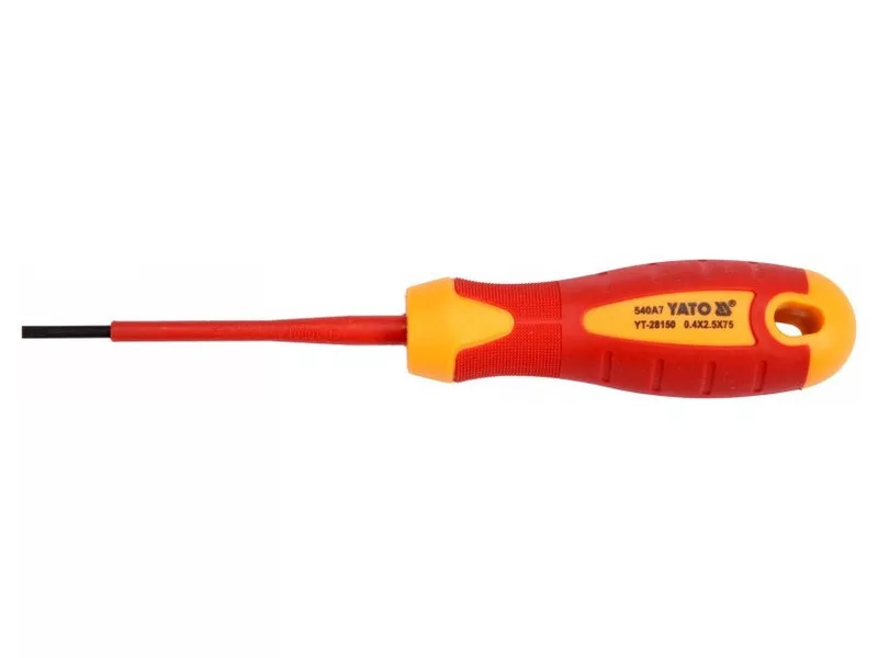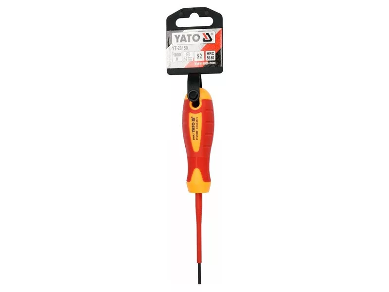 YT-28150 laposfejű csavarhúzó VDE szigeteléssel, tartós S2 acélból készült, HRC 56-60 keménységgel.