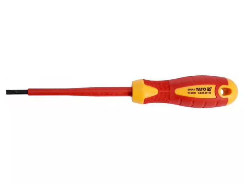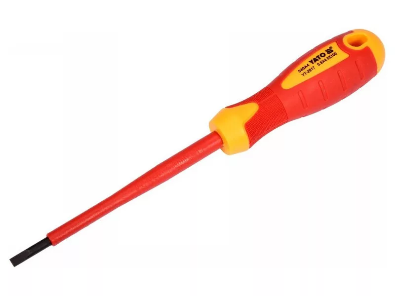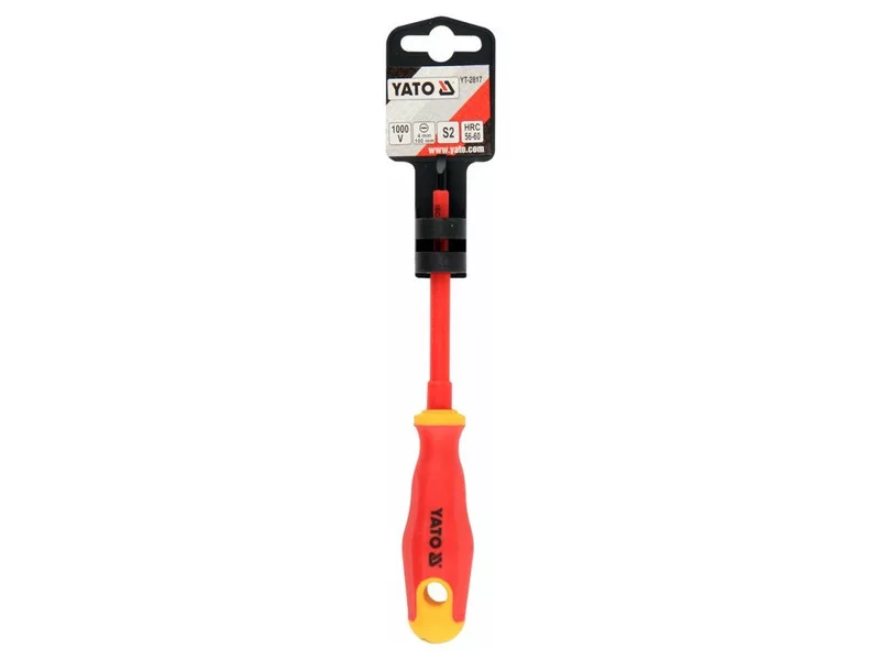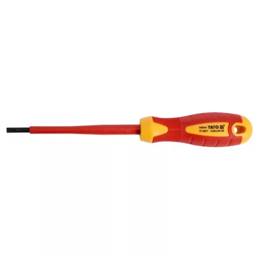 YT-2817 laposfejű csavarhúzó VDE szigeteléssel, tartós S2 acélból készült, HRC 56-60 keménységgel.