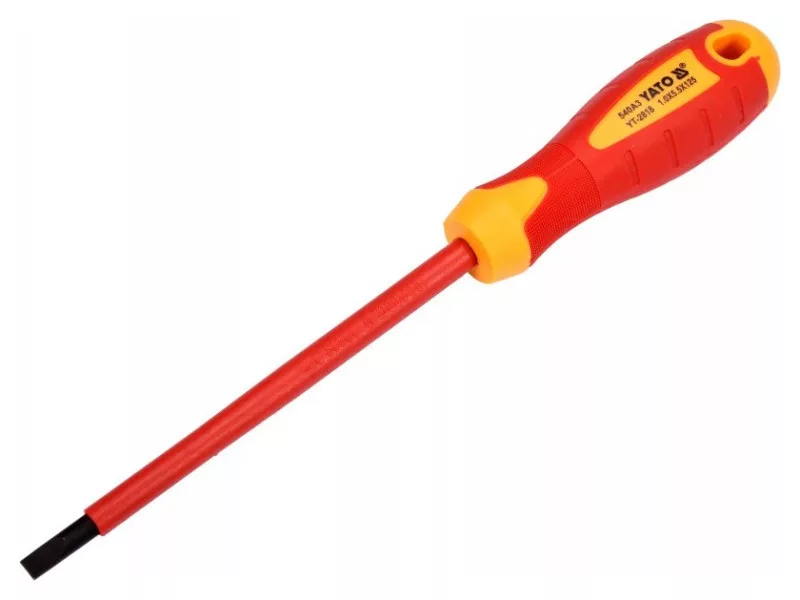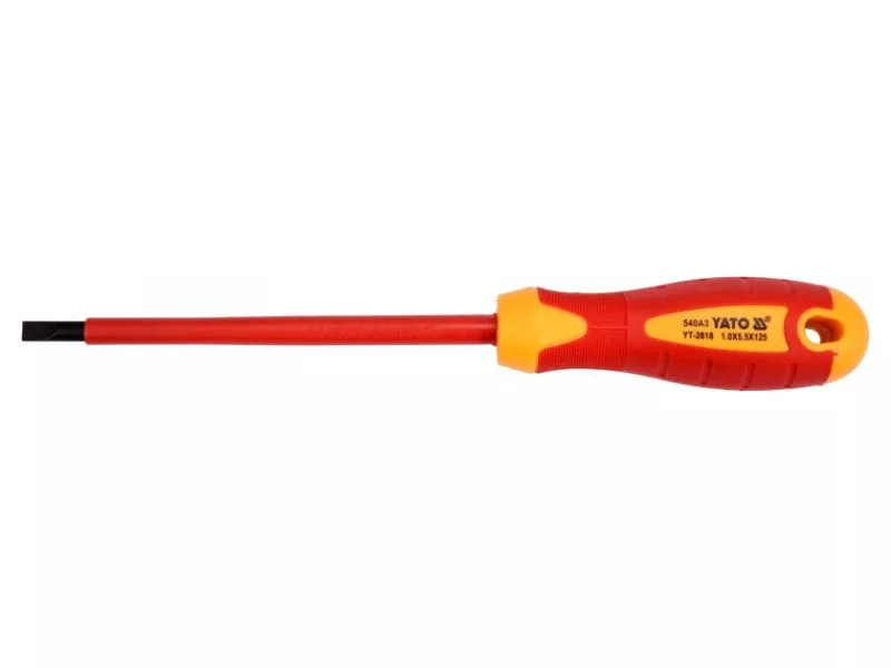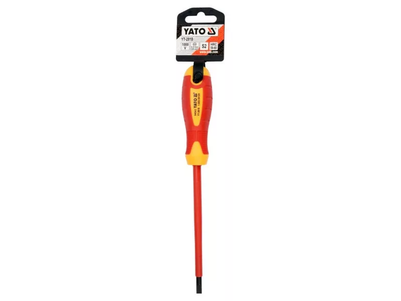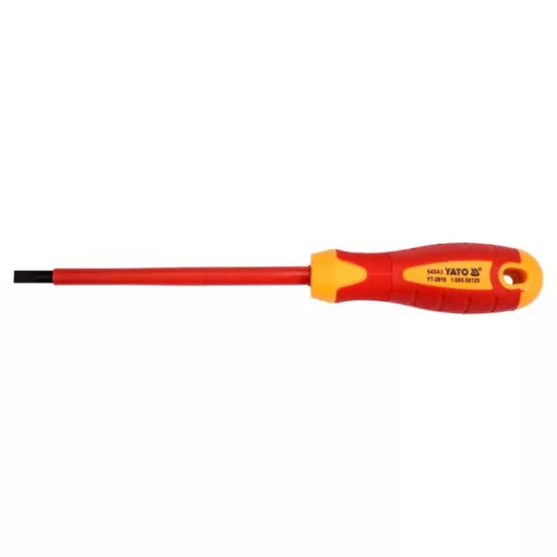 YT-2818 laposfejű csavarhúzó VDE szigeteléssel, tartós S2 acélból készült, HRC 56-60 keménységgel.