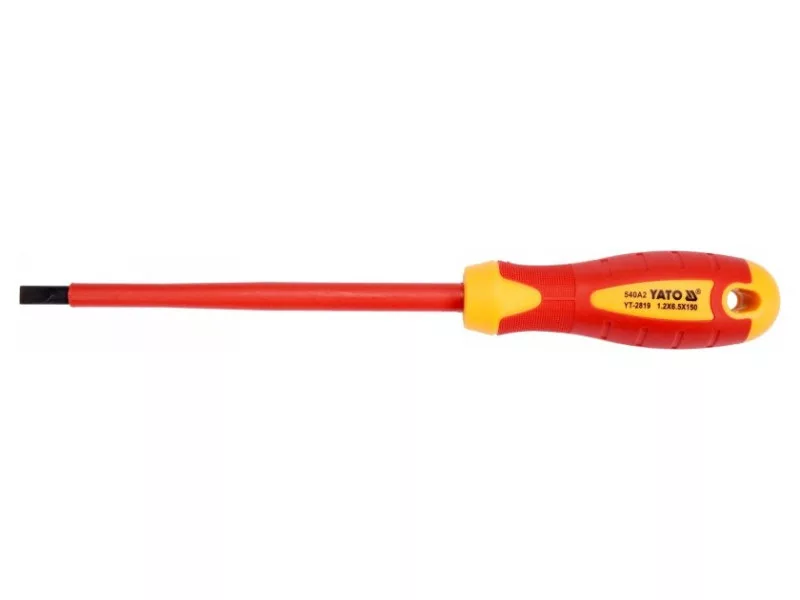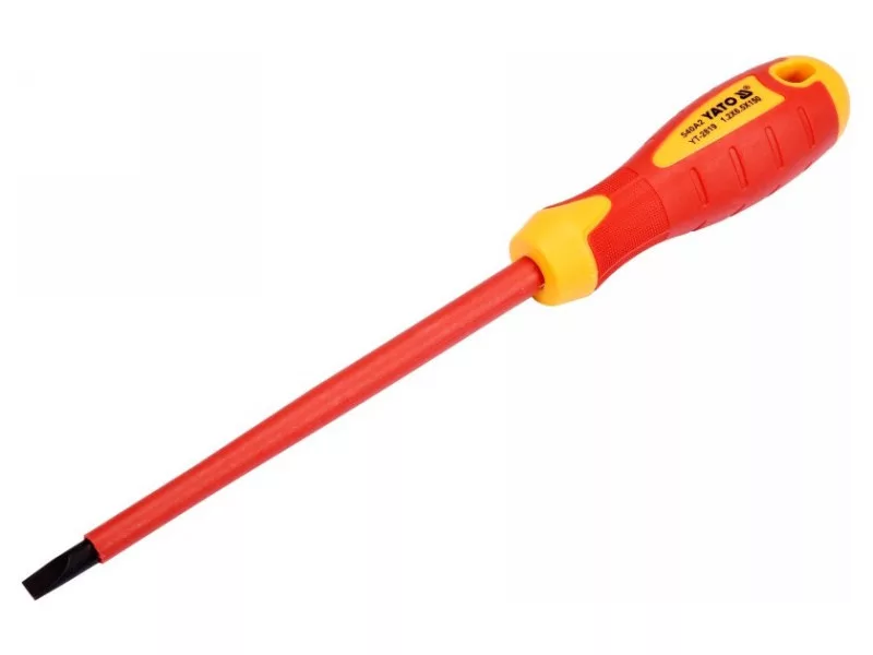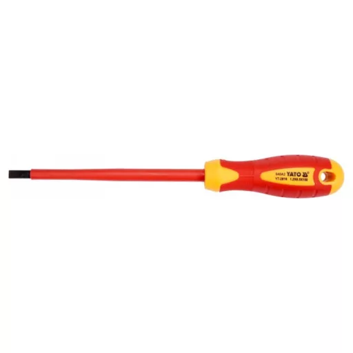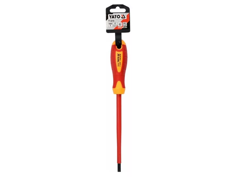 YT-2819 laposfejű csavarhúzó VDE szigeteléssel, tartós S2 acélból készült, HRC 56-60 keménységgel.