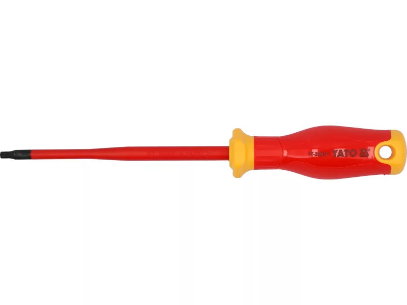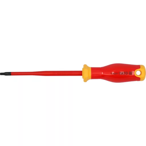Izolált csavarhúzó a slim sorozatból Torx végződéssel. A szűkített tengely kialakítása az illeszkedő szigeteléssel könnyű hozzáférést biztosít a nehezen elérhető helyekhez, valamint biztonságos munkavégzést garantál akár 1000 V-os feszültség alatt is.