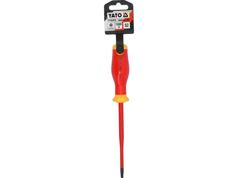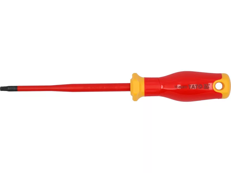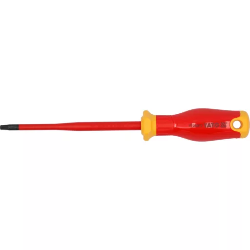 Izolált csavarhúzó a slim sorozatból Torx végződéssel. A szűkített tengely kialakítása az illeszkedő szigeteléssel könnyű hozzáférést biztosít a nehezen elérhető helyekhez, valamint biztonságos munkavégzést garantál akár 1000 V-os feszültség alatt is.